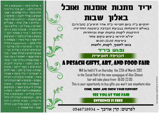 התקיים ביום חמישי כ"ח אדר תשע"ב 22.03.2012 משעה 18:00 עד 22:00